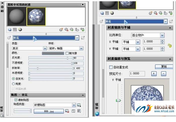 首先,要在材质面板中击“创建新材质”按钮,可命名为“青花”,接着,在“漫射贴图”中,浏览和选择你的青花图片文件。其次,在“材质编辑器”中选择类型:真实;样板:瓷砖,釉面。其它参数仿第一条设置即可。