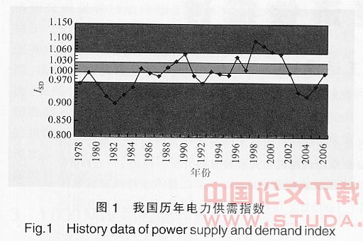 图1显示我国历年电力供需指数的变化趋势。可以看出:我国改革开放以后,生产能力得到发展,1980—1984年电力供应严重不足,特别是1982年,电力缺口约10%;1996—2001年,由于亚洲金融危机,经济发展较慢,电力需求不旺,电力供应能力过剩,1998年达到9.6%;2003-2005年,我国经济发展迅猛,电力需求大增,缺电严重。2006年有所好转。