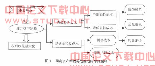 之所以存在上述问题,是因为我们忽视了纳税筹划应服从并服务于企业的理财目标,最终目的是为了有助于企业战略目标的实现,它应该服务于战略目的。当与战略目标相冲突时,应服从战略目标,所以在进行固定资产纳税筹划时,筹划者需要在筹划减税与做大报表利润以及其他非税收因素之间达到均衡。因此笔者认为,固定资产纳税筹划应从企业的战略角度出发选择筹划方式,服从并服务于企业的战略,并构成企业战略的一部分,其目的是为了实现税后收益最大化。这就要求在具体进行固定资产筹划时以追求税后收益最大化为协调原则,考虑两个方面的均衡。即降低税收成本和降低非税收成本的均衡、税收成本中的隐性税收成本和显性税收成本的均衡。纳税人通过固定资产纳税筹划减轻的税收负担只有总税收成本(显性税收成本和隐性税收成本J的降低才是理想的。为此,笔者构建了企业进行固定资产纳税筹划的战略思维架构(如图1)。