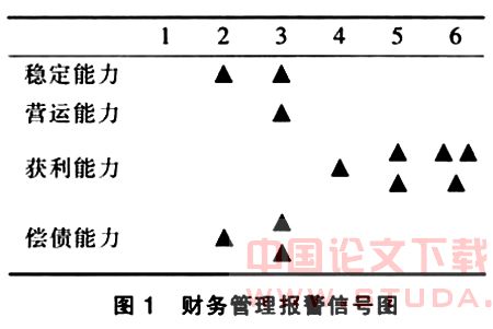 报警信号可用★、▲或◆等表示,单个符号表示轻度预警,双符号表示中度预警,三个符号表示高度预警。如图1可以给出企业财务管理某个环节的财务预警情况。