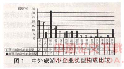 从阳朔西街的调查来看,西街旅游小企业主要的构成类型依次为:商品销售企业,住宿企业和餐饮企业。而S.J. Page的研究表明,新西兰旅游小企业的类型主要为住宿设施(40%)和餐饮设施(22%),而旅游销售企业较少,其比例仅为7%。(见图1)