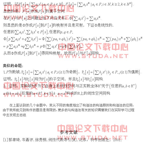 摘要:本文从高等代数课程中择选几个有代表性的例题,简要说明了构造法的应用。 关键词:构造法应用辅助...