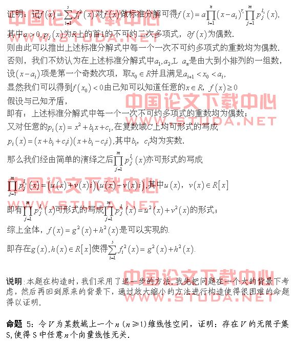 在高等代数的学习过程中,我们常常会遇到一些存在性或者潜在的存在性的定理或者命题的证明,而这类问题的证明往往是很困难的.我们需要考察一个辅助命题,通过这个辅助命题打通原命题的关节,这种证明的方法即是构造法.由于运用构造法时需要引进一个适当的辅助命题,而这个命题并不是那么容易就能够引进的,因此上,构造法要比一般的证明方法困难得多,但它在高等代数中却有着广泛的应用,特别是在证明一些难题时更具价值.本文试图通过几个命题讨论一下构造的原则与构造法的应用.