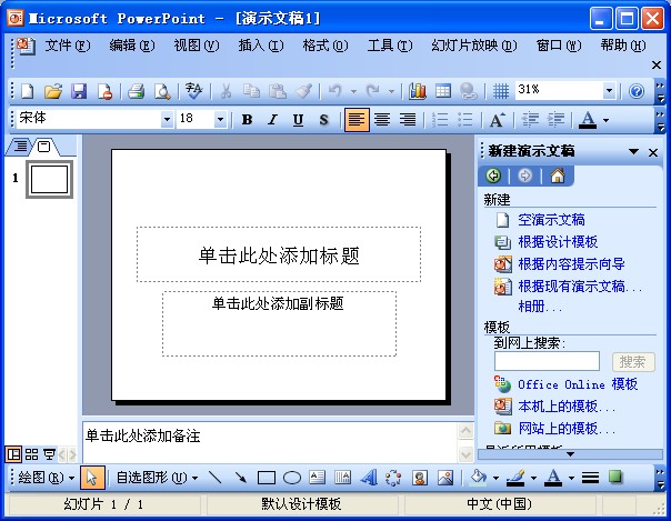 ① 启动PowerPoint后,单击【文件】/【新建】命令,或者单击【常用】工具栏上的【新建】图标 ,在窗中右侧的【任务窗格】中选择【空演示文稿】命令,如图所示。