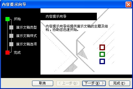 ① 在【新建演示文稿】任务窗格中单击【根据内容提示向导】命令,打开【内容提示向导】对话框。