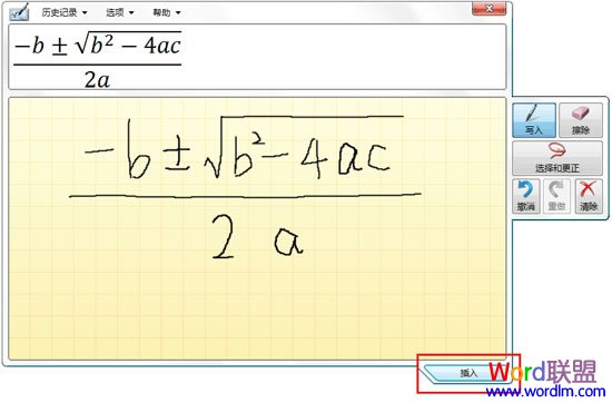 ③打开数学输入面板,写入公式,上方白色区域显示的是识别的结果。如果与您需要的公式不同,可通过右边的“选择和更正”按钮来修改。如果与您需要的公式相同,可单击右下方的“插入”按钮将该公式插入到PowerPoint的文本框中。