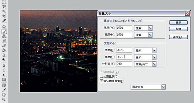 3、我们要对图片进行一下变形,让作品变成完全的方图。选择“图像—图像大小”,在对话框里去掉约束比例的选择,把长宽比例变成正方形,大小就随个人喜好。
