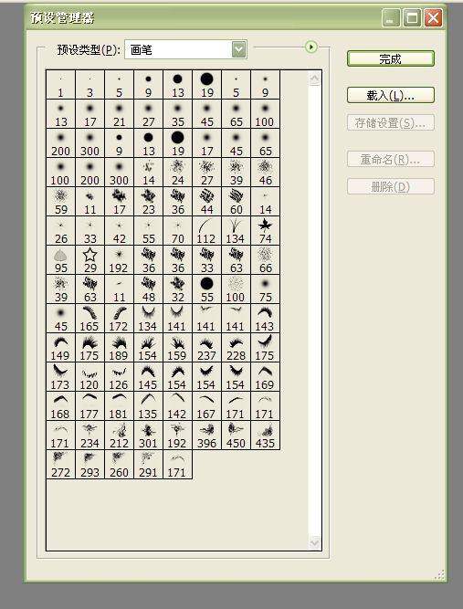 2、在弹出的预置管理器对话框中预置类型选择“画笔”。