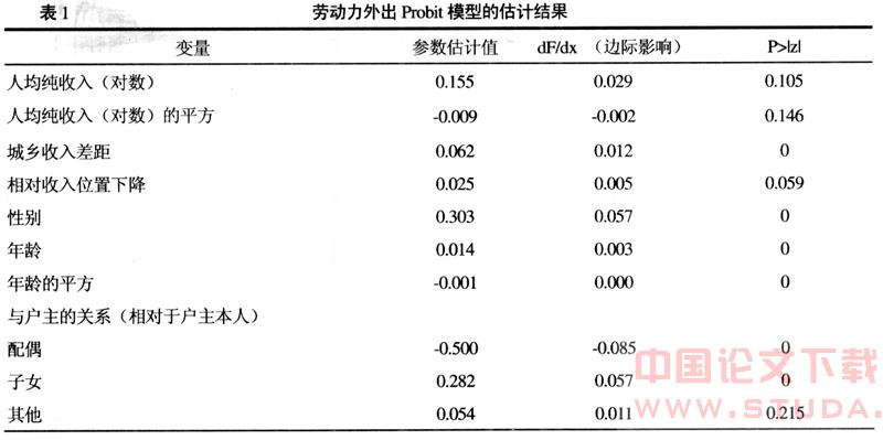 除了上文已经提到的主要解释变量外,模型中还引入少量反映家庭结构的变量(如表1)。上文已经对绝大部分变量的引入进行了解释,在此不再赘述,只对有关问题加以说明:(1)在外出务工模型中,外出务工被定义为年内到乡外从业1个月及以上,因为太短时间的外出从业的决定因素与较长外出从业可能差别较大,模型会存在结构性差异。(2)如上文所述,由于农产的收入水平和是否外出务工之间存在一定的内生关系,收入水平影响农产是否作出外出务工的决策,但外出务工反过来又影响收入水平,为解决这一问题,模型中作为解释变量的收入都用2003年的收入也就是务工前的收入水平来替代,2004年是否外出务工是不会影响到以往的收入水平的,内生性问题在此得到一定解决。(3)收入变量分为农产的绝对收入水平和相对收入水平。绝对收入水平用2003年农户人均纯收入的对数形式来表示。相对收入水平包括农村和城市相比而得的城乡收入差距,与本村其他农户相比而得的在本村的相对收入水平,以及与自身上年相比而得的在本村相对收入水平的变化情况。城乡收入差距用“2003年本省城镇人均可支配收入/本县农民人均纯收入”…来表示;农产在本村的相对收入水平用2003年农户人均纯收入在本村10个样本户中的排序(1,2…10)来表示:相对收入水平的变化情况用农产相对收入水平是否下降来表示,如果2003年农产排序的位置低于其在 2002的排序位置,则认为该户相对收入水平下降。