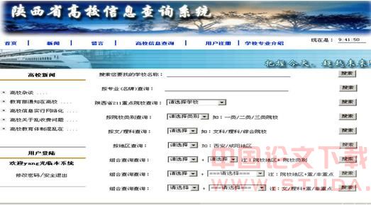 陕西省高校信息查询系统是以中国教育网、陕西省教育信息网、陕西省毕业生就业信息网等大型网为主要的参考对象进行研究。该系统可以实现许多不同关键字、不同类别的查询,能按照不同的地区、不同的高校名称、重点建设院校、211院校、几种组合查询等来分类查询相应的高校信息。用户可以从高校新闻栏获取一些重要的信息,用户留言部分便于用户对高校信息以及系统提出建议或意见。后台数据库采用SQL语言进行数据库的实时录入、删除、更新等管理工作。研究设计该系统是为了更好、更方便地满足不同用户对陕西高校信息的查询。